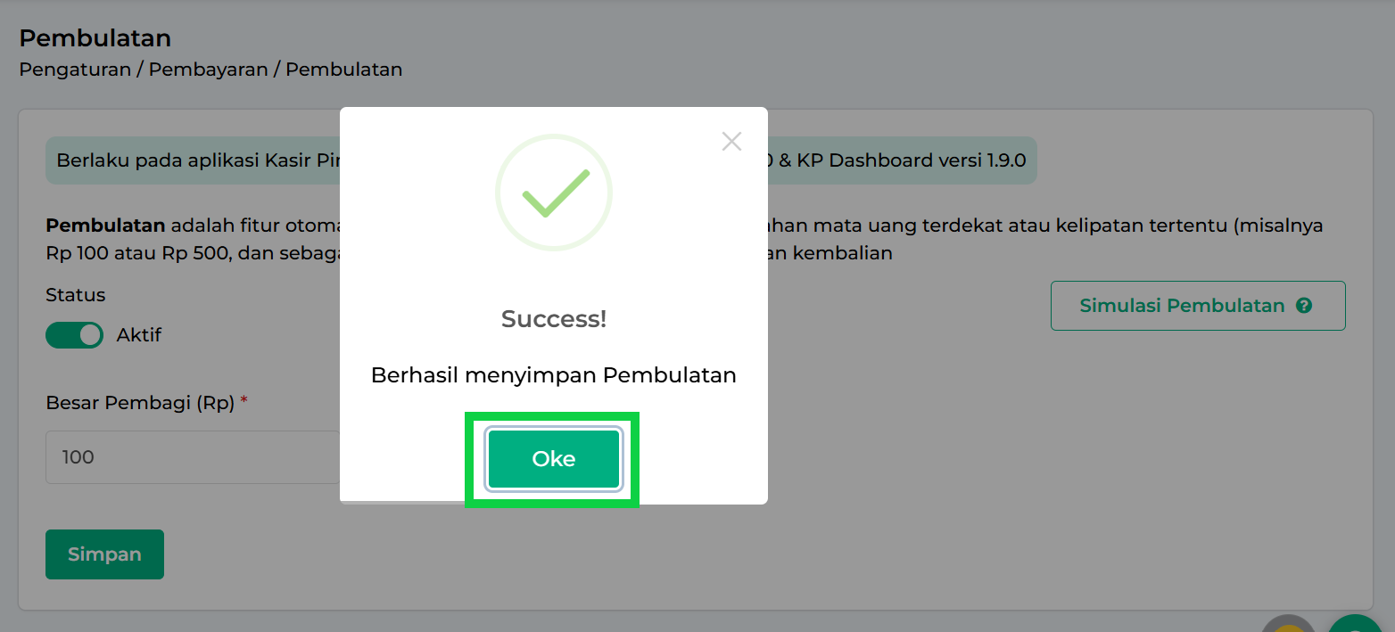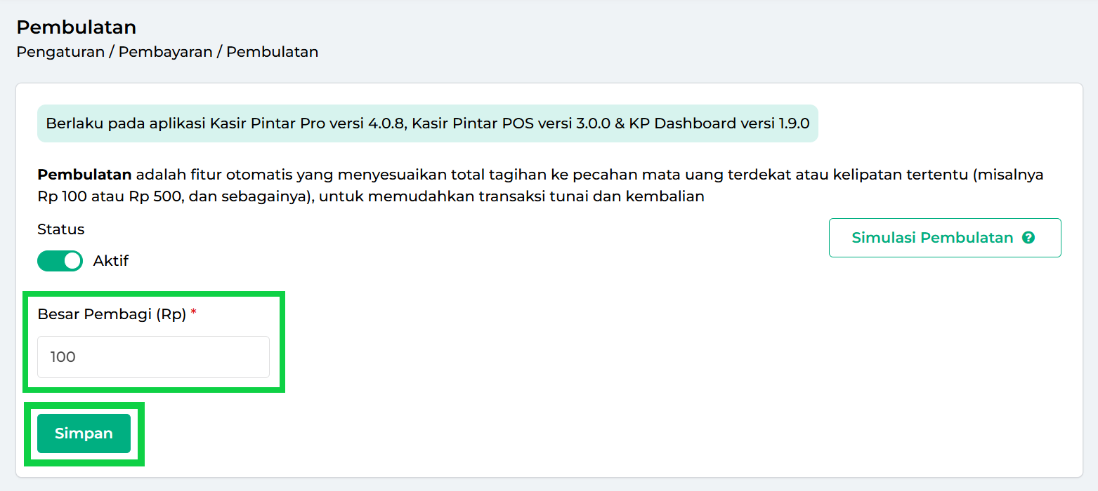 Fitur Pembulatan berfungsi untuk membulatkan total transaksi pecahan secara otomatis ke nominal tertentu sesuai pengaturan, seperti kelipatan 100, 500, atau 1.000. Nominal acuan pembulatan ini disebut Besar Pembagi.