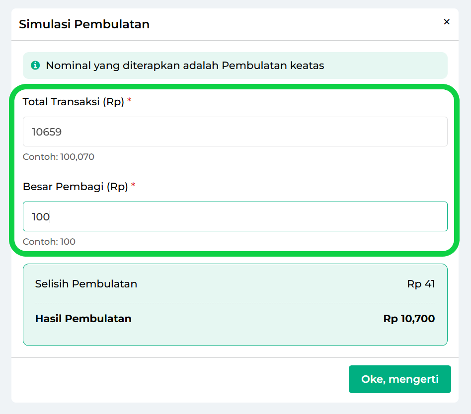Masukkan contoh Total transaksi pecahan dan Besar Pembagi untuk menjalankan simulasi. Kemudian, sistem otomatis menampilkan selisih dan hasil pembulatan sesuai nominal yang Anda masukkan.